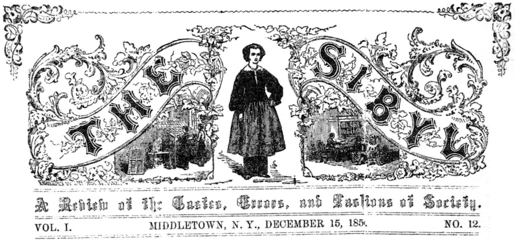 Meanwhile, back in Orange County, John Whitbeck Hasbrouck, scion of the Huguenot Hasbrouck family of Ulster County, established the Middletown Whig Press. The Press combined what it called a "full and accurate compend of intelligence from all parts of the country" with earnest advocacy of the anti-slavery cause and other liberal reforms of the day. Hasbrouck invited Lydia Sayer to lecture in Orange County in 1856. After Lydia's lecture tour, John Hasbrouck offered to help Lydia establish her own newspaper in Middletown. Lydia accepted, moved to Middletown, and began editing The Sibyl, A Review of the Tastes, Errors and Fashions of Society.8