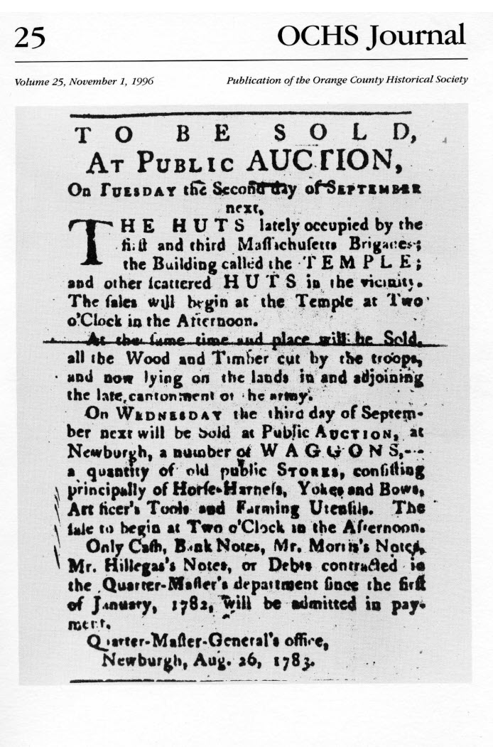 Two public auctions took place in the fall. The New York Packet announced an auction of huts of the 1st and 3rd Massachusetts Brigades, the Temple building and miscellaneous huts and all the unused wood and timber cut by the troops scheduled for September 2 at the Cantonment's Temple Building. The following day, wagons, tools, harnesses and various equipment and sundry public stores were sold in Newburgh.