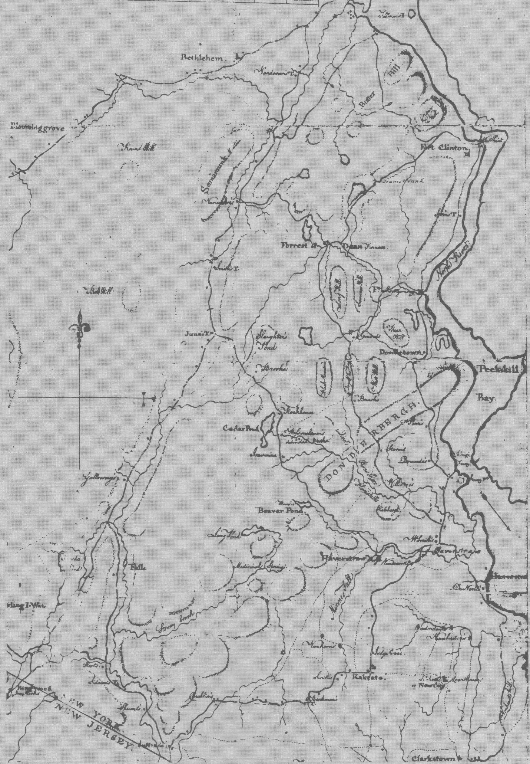 One of the most important was the ten-mile-long footpath that branched from the Clove Road at June's Tavern at Harriman and crossed the mountains to Haverstraw by way of Slaughter's Pond (now Forest Lake) and the Cedar Ponds (now Lake Tiorati). Charles Clinton referred to it as part of "Ye Road from Goshen to Haverstraw," and later frequent mention was made to it in testimony delivered in 1785 at the proceedings held at Chester to determine the disputed boundaries of the Cheesecock and Wawayanda patents. Weather-beaten inhabitants who were long resident in the county deposed at the time that the path was the only direct route through the mountains that connected Smith's Clove with the river settlements in lower Orange where the courts were held; otherwise, those contemplating the arduous journey would have to travel down the Clove to Suffern to make the circuitous turn into southern Orange at the Point of the Mountain.