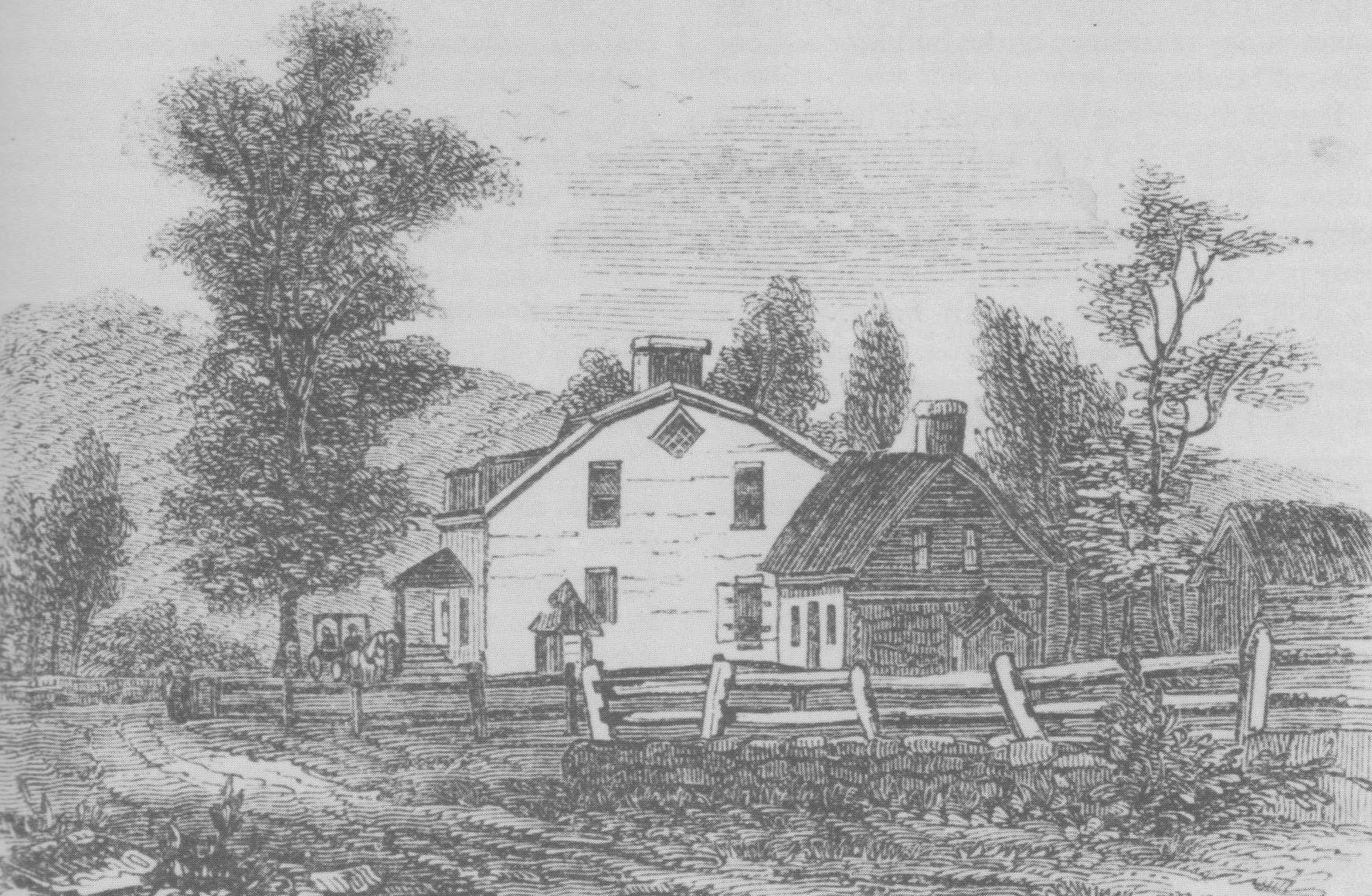 Suffern's Tavern, corner of Washington and Lafayette Avenues in Suffern. Woodblock engraving by Benson John Lossing (18131891) from a sketch by William McLeod (or MacLeod), published in 1851 in Harpers New York and Erie Rail-Road Guide Book, five years before the tavern was demolished.