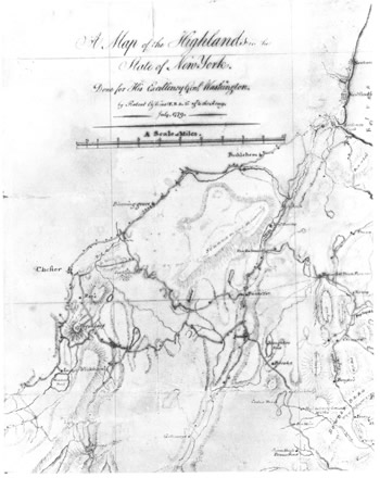 A MAP OF THE HIGHLANDS IN THE STATE OF NEW YORK July 1779. Detail from a manuscript map of the Hudson Highlands on both sides of the Hudson River drawn for His Excellency General Washington by Robert Erskine (1735-1780), Geographer to the Continental Army. The detail illustrated centers on the mid and northern area of Smith's Clove and depicts the course of the Clove Road, extending diagonally from Galloway's tavern at Southfields at the bottom center to New Windsor and Newburgh at the upper right. Also shown are the lateral roads leading westward from the Clove to Chester, Blooming Grove and Bethlehem, and eastward to the Forest of Dean, West Point and the Hudson. The now-vanished Haverstraw road, passing through the Palisades Interstate Park and connecting the Clove at June's tavern at Harriman with the settlements in lower Orange (now Rockland) County, is at the lower right. Other roads, not surveyed, are indicated by dotted lines. An important feature is Erskine's delineation in the Clove corridor of the encampments of Washington's three divisions at June's tavern, along Route 32 in Central Valley and on John William Smith's farm in Woodbury Valley below Mountainville. Aside from its preparation for the commander-in-chief, Erskine's map is of interest in its association with Brigadier-General Anthony Wayne, then recently arrived from Pennsylvania. On July 1, 1779, Washington formally assigned him to command the newly-formed corps of light infantry, with confidential instructions to look into the possibility of a surprise attack on the British post at Stony Point, and to acquaint himself with the terrain and state of the enemy garrison. Two days later, pursuant to Washington's order, Erskine wrote to Wayne from New Windsor, transmitting the map with Washington's request "that no Copies whatever be permitted to be taken of it." Bob McDonald, who carefully researched the circumstances of Erskine's chart, offers the interesting commentary that the map may well have been used by Wayne during his planning with Washington of the assault on the British post, and points out that another letter, exactly duplicating the date and content, was also sent to Baron von Steuben, which clearly indicates that at least two charts, presumably identical, were completed by Erskine early in July. Courtesy of the Historical Society of Pennsylvania.