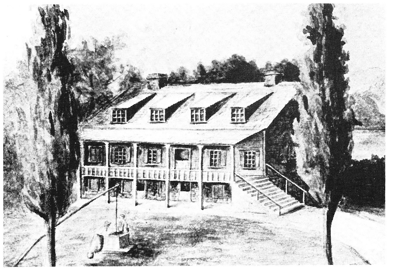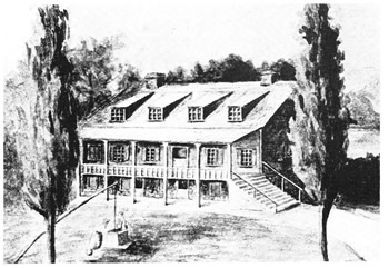 ROBERT ERSKINE HOUSE, Ringwood State Park, New Jersey When Robert Erskine arrived at Ringwood in 1771 to manage the ironworks, he moved into a "large dwelling house" on the grounds formerly occupied by the ironmaster Peter Hasenclaver and previous owners, and here spent the remaining nine years of his useful life. In 1771 he wrote that "the mansion house has been patched together at different times which makes it a very acquard [awkward) piece of architecture"; but it must have been commodious and comfortable despite his implication that it was of architectural ungainliness. Chastellux called it in 1780 "a very handsome house". In 1804, when again offered for sale, it was advertised as "an elegant Mansion House, 92 feet front, and about 30 feet deep", on which a large sum of money had been expended to put it "in perfect repair". The house either burned or was razed around 1807 when it came into the possession of the Ryersons. When Abram S. Hewitt acquired the property and moved to Ringwood in 1857 he commissioned an artist to paint a picture of the house from descriptions given by elderly people who remembered the building, a small watercolor now in the collection of the Manor House at Ringwood State Park and here reproduced. As given, it shows decided Hudson Valley architectural features similar to the Van Cortlandt Manor House at Croton and the Colonel Thomas Ellison House formerly on the river bluff at New Windsor. Edward Ringwood Hewitt, Abram's son, who knew the Ringwood country, stated in old age in 1946 that the house stood in front of the present Manor House in Ringwood State Park, and in very dry seasons the line of the rear wall of Erskine's house beneath ground level was discernible through discoloration of the earth and grass.