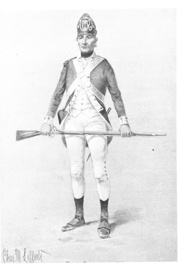 2nd Canadian Regiment, corporal of light infantry company in parade dress 1776, with painted cipher "C.O.R.". (Congress' Own Regiment) on leather cap. Hazen's regiment served as the last garrison at the Pompton entrance to Smith's Clove and at the Sidman's bridge blockhouse in the winter of 1782-83. Water color by Charles Mackubin Lefferts (1873-1923). Courtesy of the New-York Historical Society.