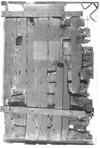 THE BLOCKHOUSE DOOR The last vestige of the Sidman's bridge blockhouse on the Ramapo, erected in 1781 under supervision of Major Jean Bernard Gauthier de Murnans of the Continental Corps of Engineers. Now in the collection of Washington's Headquarters State Historic Site at Newburgh. The heavy door is 6 feet 2 inches in height, 4 feet wide and 3 inches in thickness, crudely but strongly constructed of two layers of 1 1/2 inch oak planking; the exterior face consisting of five vertical planks (one now missing), and the interior of nine horizontal planks of varied widths, fastened with hand-wrought iron spikes about 5 inches long that were driven through both layers from the inside and clinched on the outside. It was hung by two huge wrought iron hinges, 3 feet 8 inches long and 3 inches wide, each with six holes through which bolts were passed to fasten them to the door. A square 3-inch hole was cut through the door near the top. Courtesy of the New York State Office of Parks, Recreation and Historic Preservation.