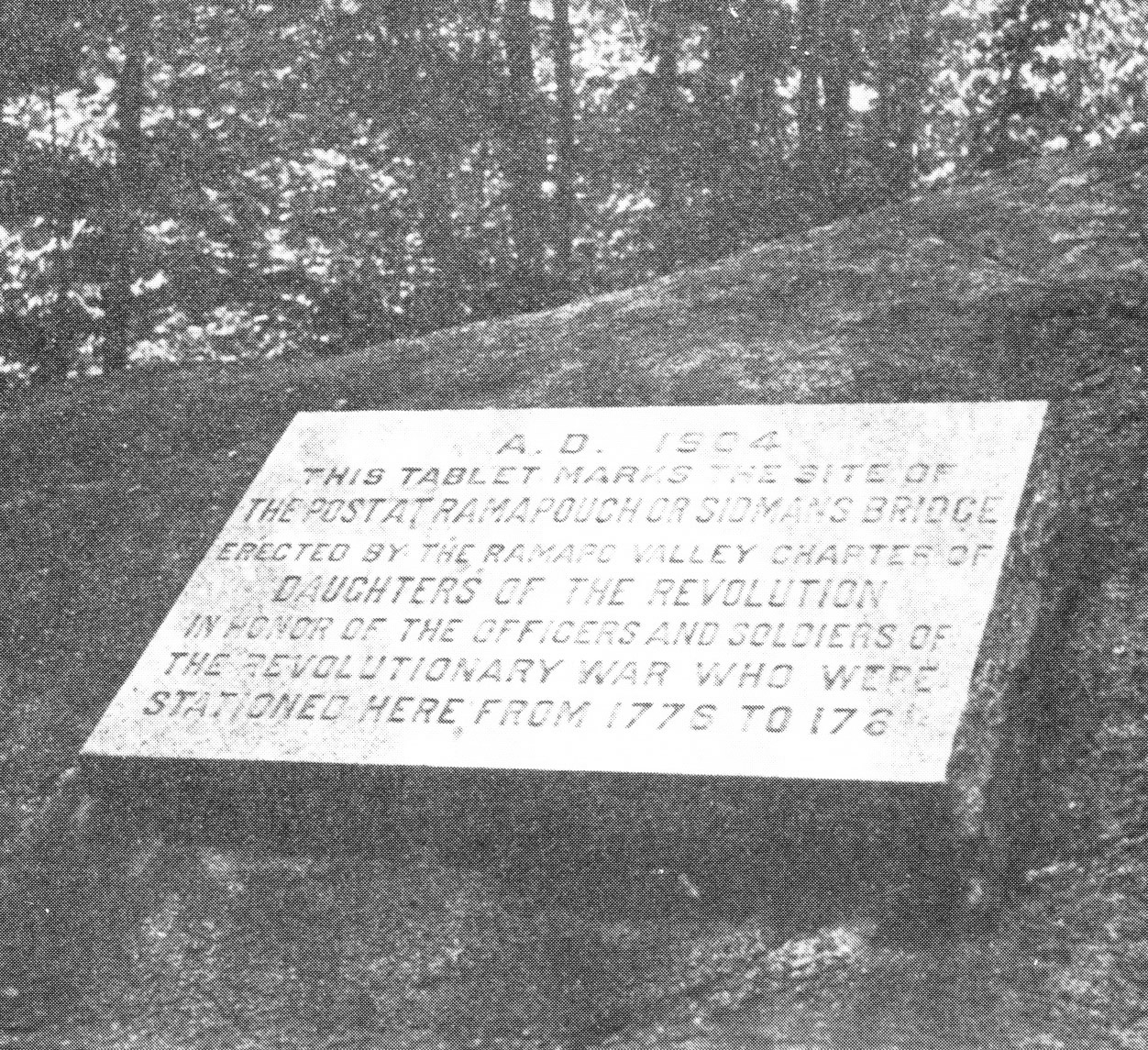 The Daughters, a local group chartered in 1898 and based at Ridgewood, New Jersey, operated as the Ramapo Valley Chapter and on June 28, 1904, dedicated a polished granite tablet fastened on a huge boulder on the earthworks at a ceremony attended by about 500 people at which Mr. Suffern and Clarence Lexow of Nyack delivered the principal addresses. The tablet and boulder are on the west side of Route 17, which is now routed through the hollow, and the inscription reads: